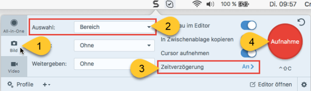 ในแถบเมนูให้คลิกที่ไอคอน TechSmith Snagit เพื่อเปิดหน้าต่าง Capture บนหน้าจอ จอภาพ ถ้าคุณอยู่ในตัวแก้ไข Snagit ให้คลิกปุ่ม Capture ในแถบเครื่องมือเพื่อเปิดหน้าต่าง Capture